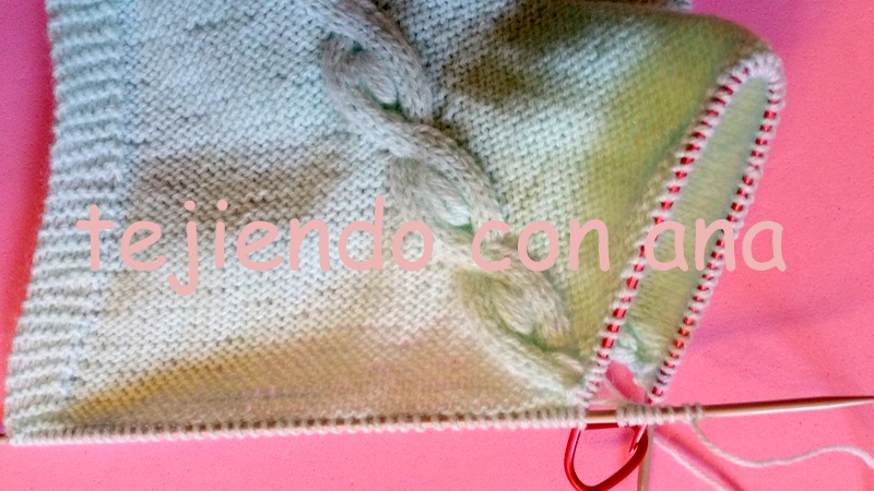 Para talla RECIÉN nacido montad 82 puntos CON ESTA SEPARACIÓN así:15-11-30-11-15 =82 puntos, SIN OLVIDAROS DE LOS 2 AUMENTOS , 1 antes y otro después de cada trenza y siempre por el lado del derecho, seguir trabajando así hasta que TENGÁIS 50 puntos EN CADA MANGA, entonces ya HACÉIS LA DIVISIÓN aumentando debajo de la manga 6 puntos y cuando tejáis la manga, aumentar 3 a cada lado de los 50, para compensar los anteriores aumentos que hemos hecho debajo , en el cuerpecito.