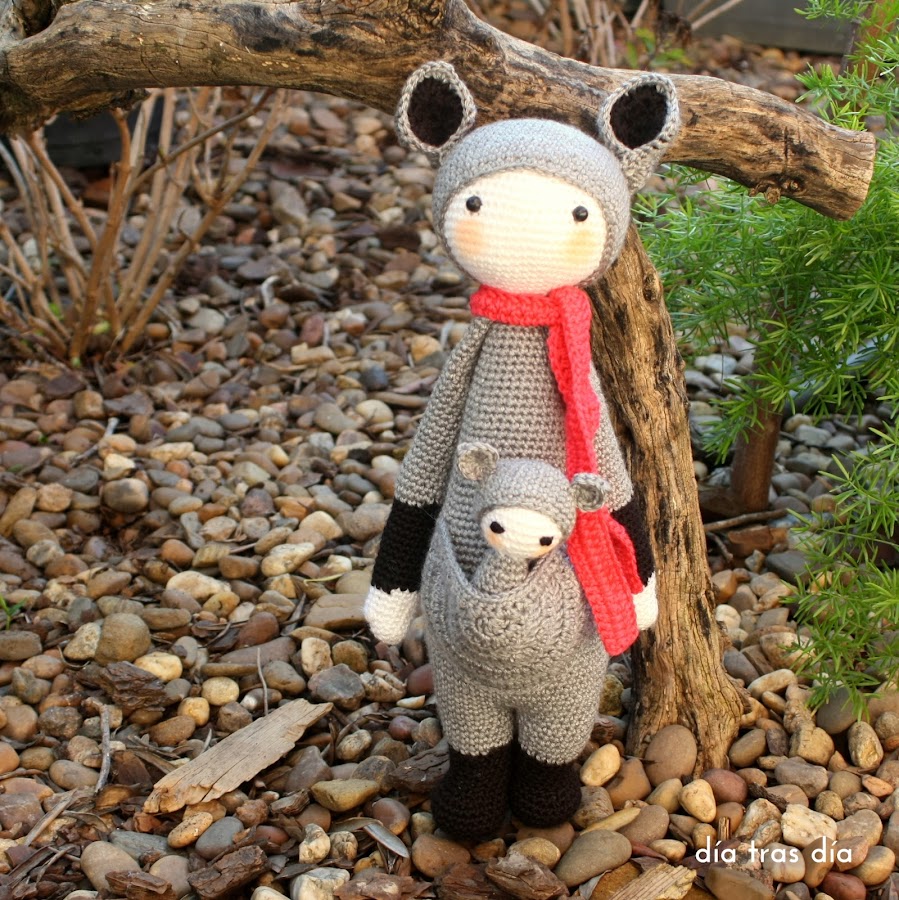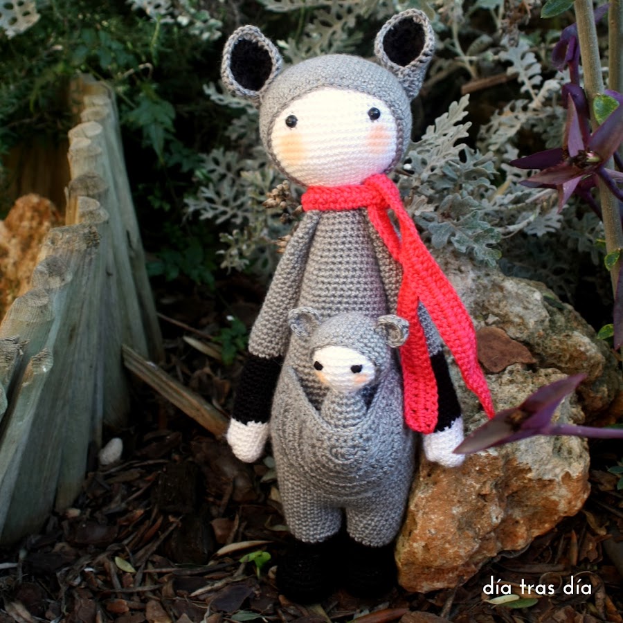 Para Nora hice un nuevo cangurito Kira, con su bebé en el bolsillo de la barriga. Para diferenciarlo de los otros dos canguros que ya había hecho anteriormente (que podéis ver aquí y aquí), le hice la bufanda en un color diferente. Esta vez la bufanda fue en color fucsia (aunque en las fotos no ha salido muy definido el color y parece más bien un tono rojo).
