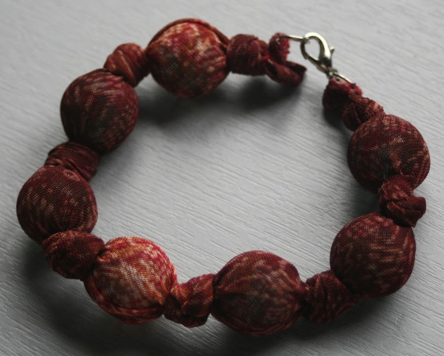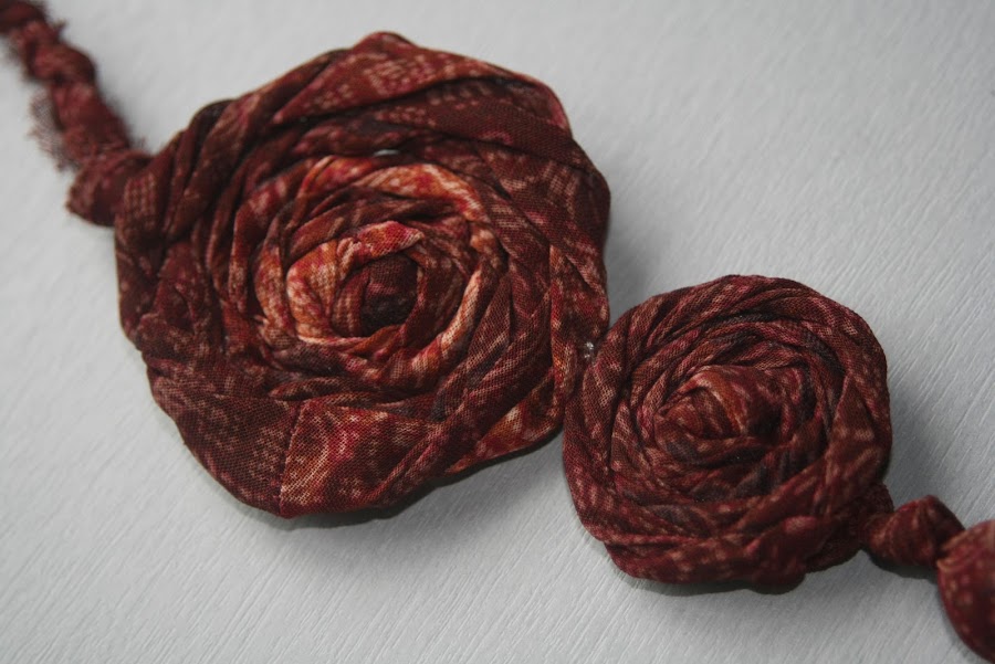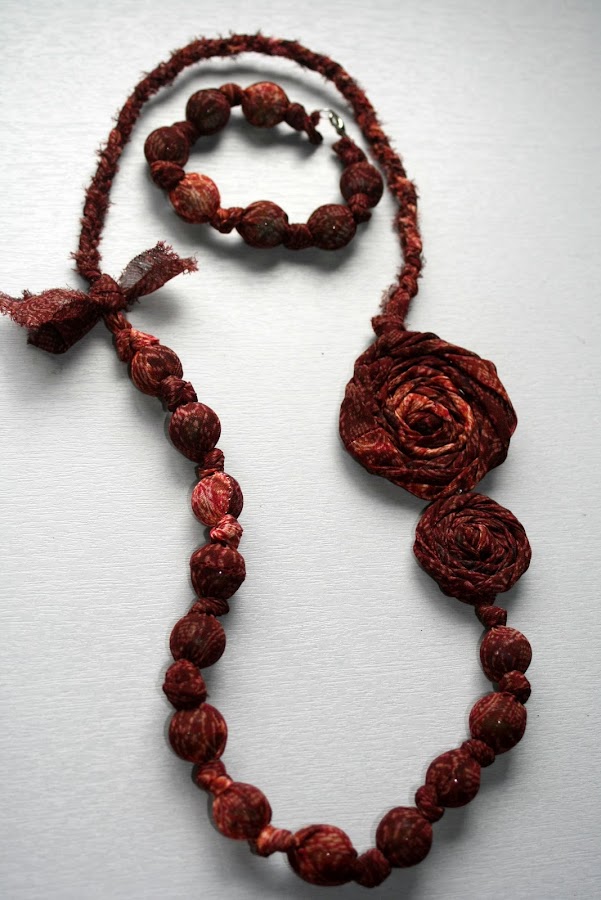 Después de descubrir el modelo que ya enseñé en una entrada anterior realizado con canicas, he vuelto a hacer otro igual, aunque dándole un toque que lo hiciera diferente. El primero que hice fue solamente a base de nudos y canicas embutidos en tela. El siguiente fue igual, pero añadiendo cuentas de madera a la serie de canicas y nudos. Y este último que he realizado, lo he adornado con unas flores hechas de la misma tela que el collar. Como me gusta tanto investigar y aprender nuevas cosas, decidí intentar hacer una flor que había visto en varios blogs de manualidades y que me había gustado bastante. Pues me puse y creo que para ser la primera que he hecho, no ha quedado demasiado mal. Supongo que las próximas irán quedando mejor, a medida que vaya adquiriendo práctica.