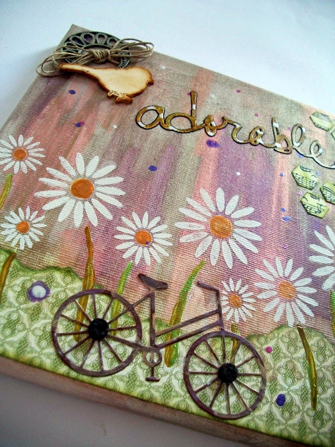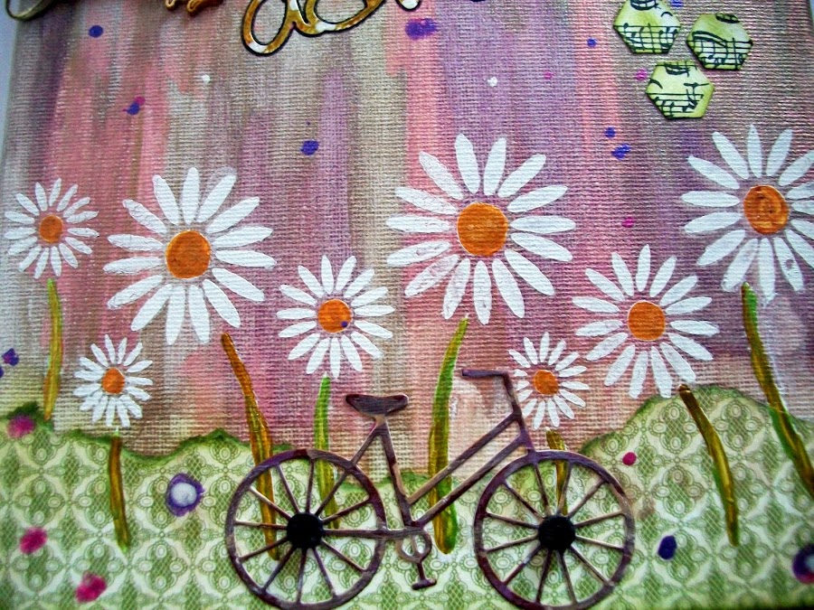 Las margaritas son el motivo central del trabajo y están hechas con pasta de textura con un stencil cortado con la Cameo.
