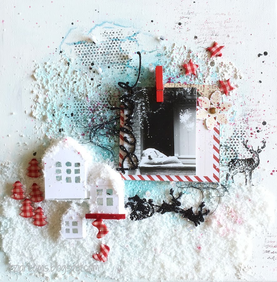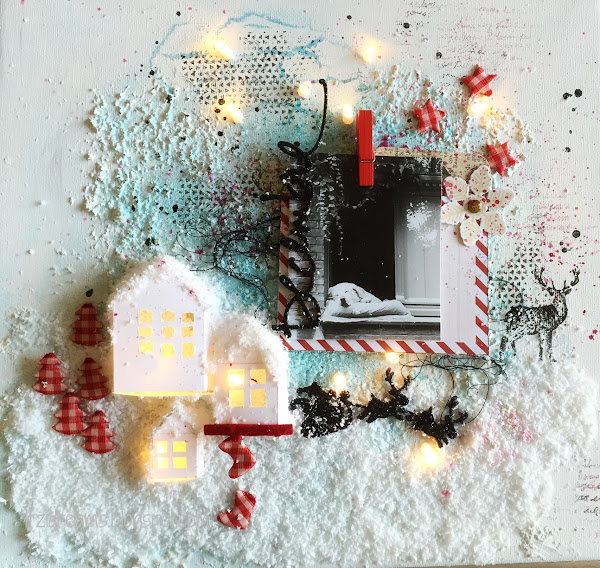 El fondo está hecho con acrílico, gesso, craquelado y pasta texturizada. Para los elementos decorativos he usado un poco de todo: telas, papeles decorados, sellos, polvo efecto nieve, etc... Y para darle un toque mágico unas casitas 3D donde por dentro tienen la instalación de luces. Es muy fácil su instalación: hacemos unos pequeños agujeros en la tela para poder sacar las bobillas por allí, y pegamos la base de las pilas con Washi Tape, y listo.
