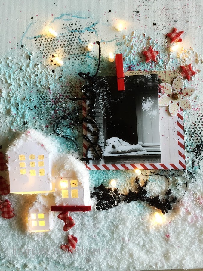 En esta ocasión he hecho algo especial, un canvas mix media con mucha textura y una instalación de luces ( Heidi Swapp) que le da ese toque mágico que tiene la navidad.