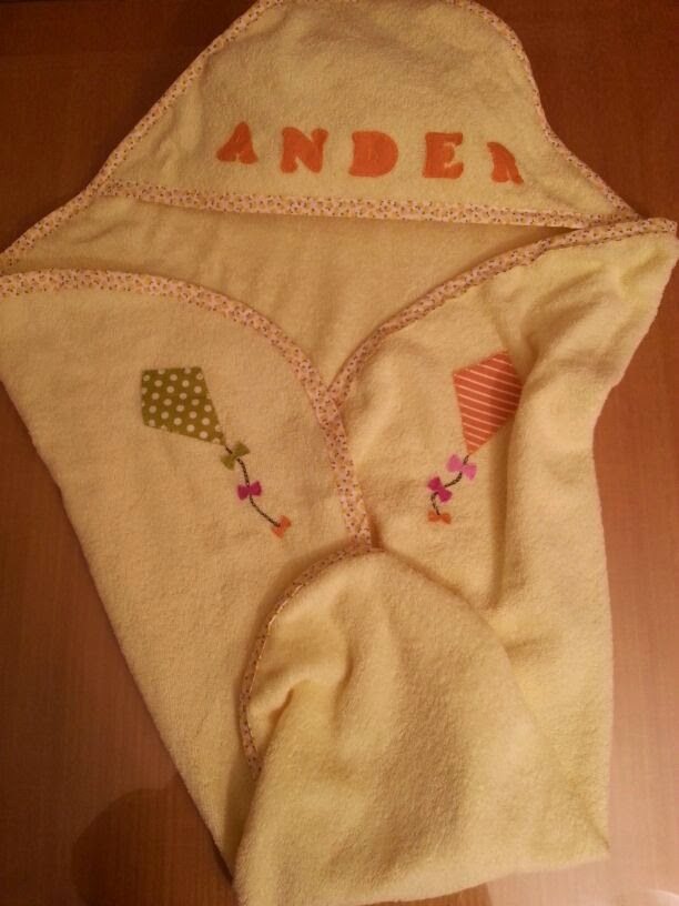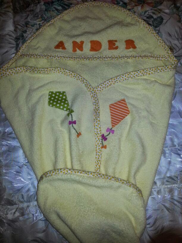 Traigo otra capa de baño para un niño al que le van a poner de nombre ANDER, es un regalo muy practico y personalizado, lleva un biés con limones amarillos que le van muy bien con el color de la felpa.