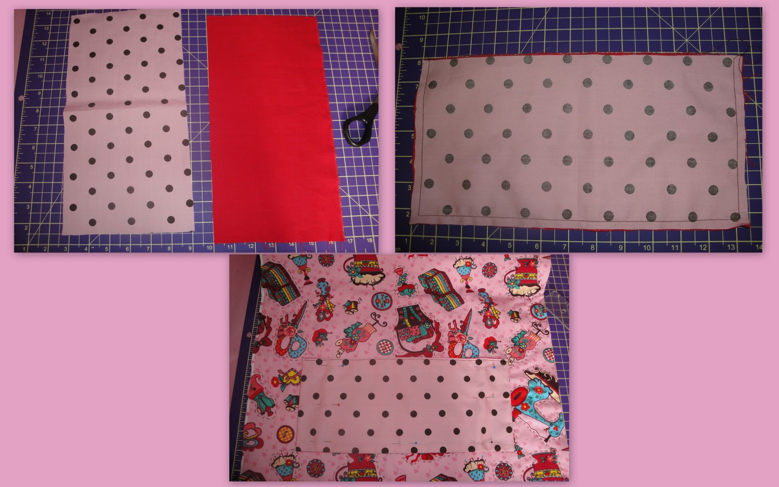 2- Costure direito com direito nos três lados, deixando a parte de cima do bolso aberta para revirar. Revire, passe a ferro e dobre as bordas para dentro, passando e costurando.