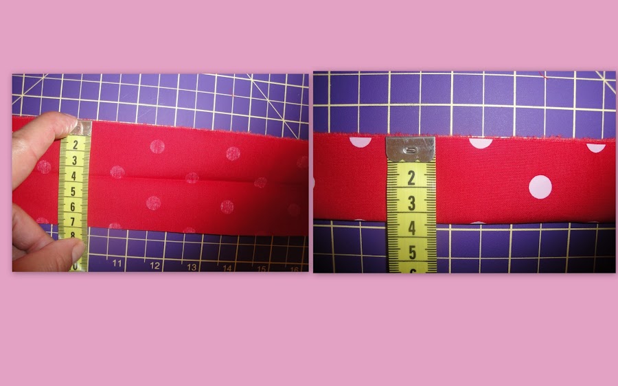 1- Corte uma faixa de 7cm de largura e uma vez e meia a medida da borda a ser pregada