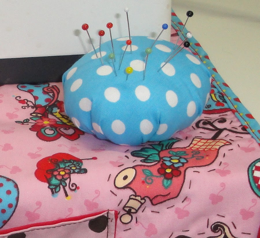 Por último, fiz essa alfineteira a partir de um fuxico de 10cm de diâmetro e enchendo com fibra e retalhinhos de tecido. Mas você pode fazer uma flor, ou outro modelo que preferir. Basta costurá-la com alguns pontos à mão, onde achar melhor.