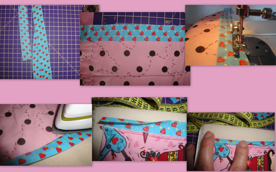 Para dar acabamento nas laterais do tapetinho, cortei o viés nesse tecido turquesa com corações vermelhos. Aprenda a fazer o viés aqui