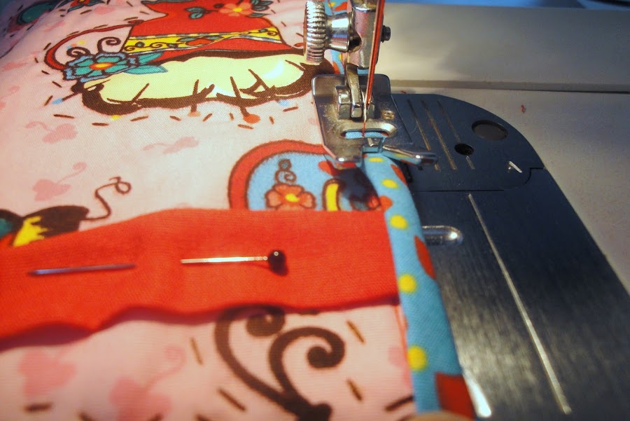 Como não queria fazer costuras de matelassê sobre meu estampadinho fofo, optei por bordar uma espécie de quilt manualmente só em alguns desenhos, para segurar as camadas de tecido. Usei linha de costura, mesmo!