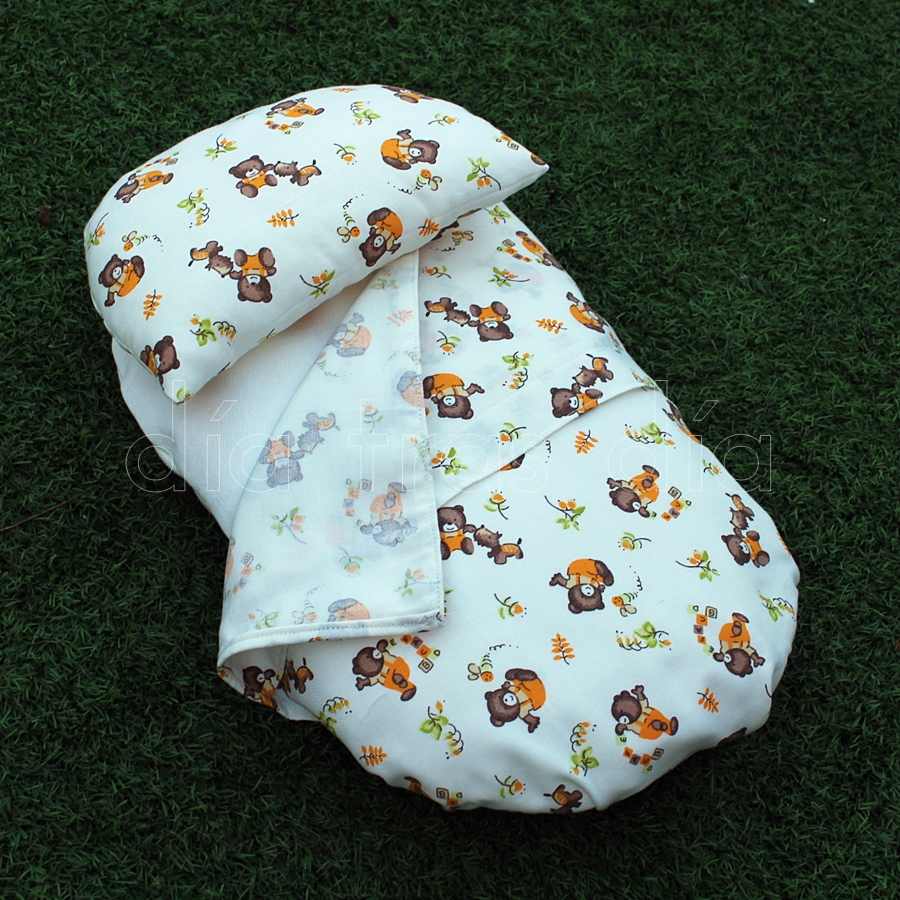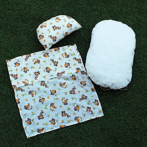 Pero el capazo solo quedaba un poco tristón, así que decidí hacerle un colchón y una sabanita para que quedase bien vestido. Tenía una tela en casa con estampado de ositos que me pareció perfecta para esto y así es como quedó el conjunto de colchón, sábana y almohada, todo hecho a mano por mi: