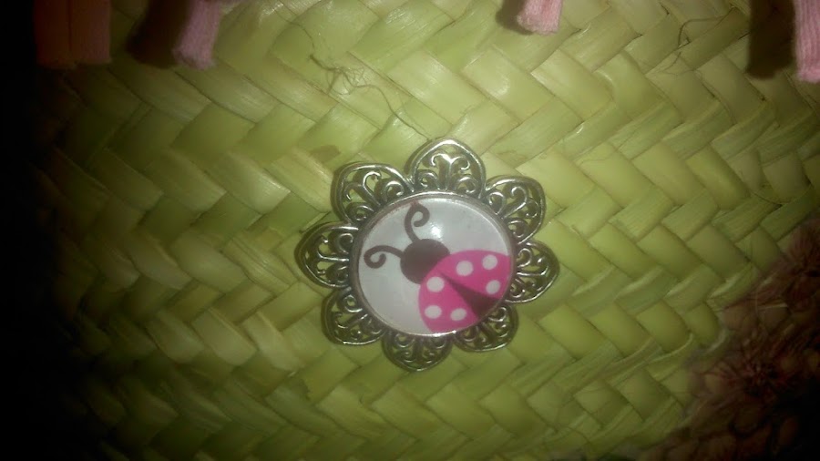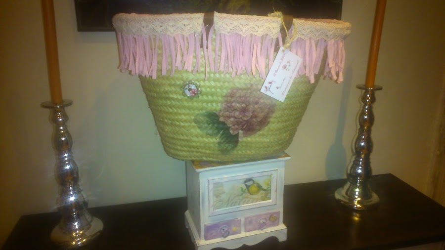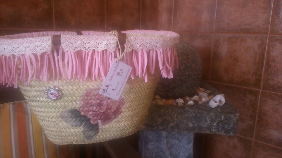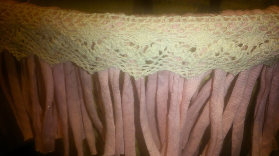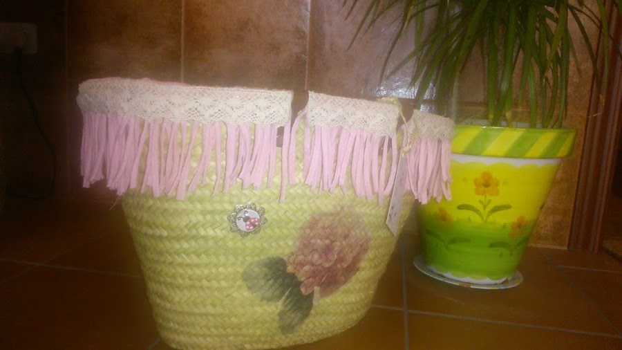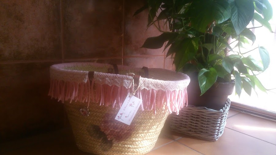 Este capazo le he puesto trapillo de flecos que tanto se llevan, con una cinta de puntillita