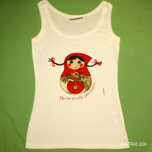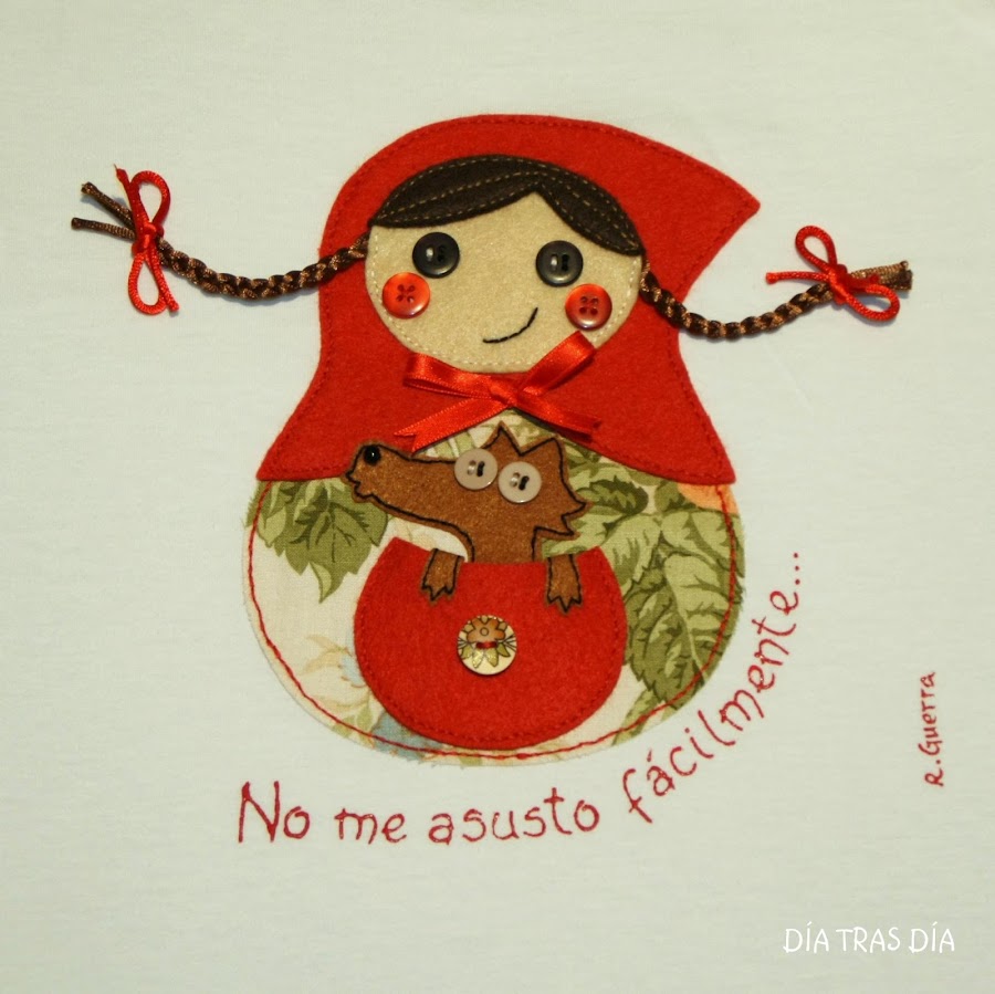 En esta ocasión, os enseño un encargo que me hizo Pilar a principios del mes pasado. Me escribió un correo para comentarme que le gustaría saber si podría hacerle una camiseta con personajes de cuentos. En concreto, me dijo que le entusiasmaba el cuento de Caperucita y me planteó que le hiciese un dibujo que hice ya hace bastante tiempo en una camiseta con Caperucita y el lobo dándole un beso. Esta camiseta anterior la había hecho con un dibujo que no era diseño mío, así que, como no me parecía bien andar con dibujos que no eran propios, le planteé que si le gustaría una Caperutrioska, que al fin y al cabo, seguía teniendo la esencia de Caperucita, pero con un toque diferente.