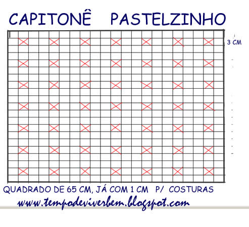 Então aqui está o gráfico: usando quadrados de 3 cm, são 21 colunas; logo 21 x 3 = 63 cm; mais 1 cm de costura de cada lado são 65 cm.