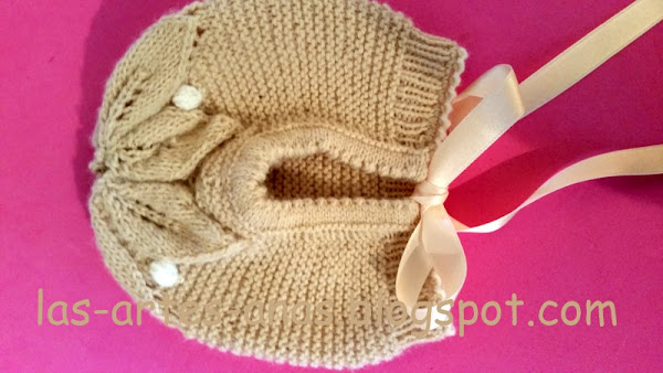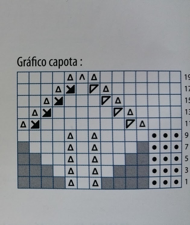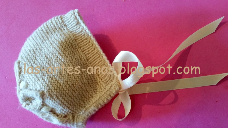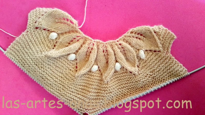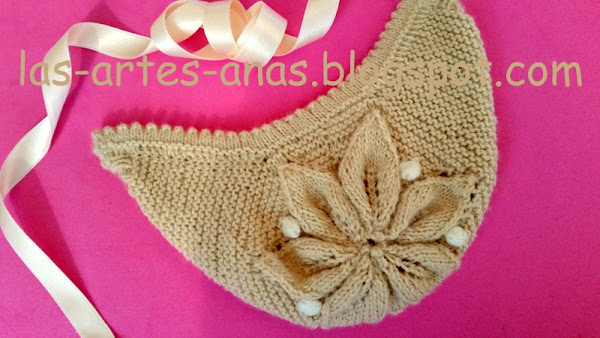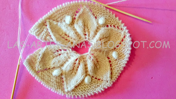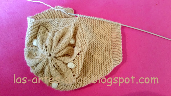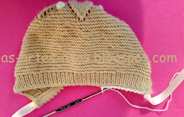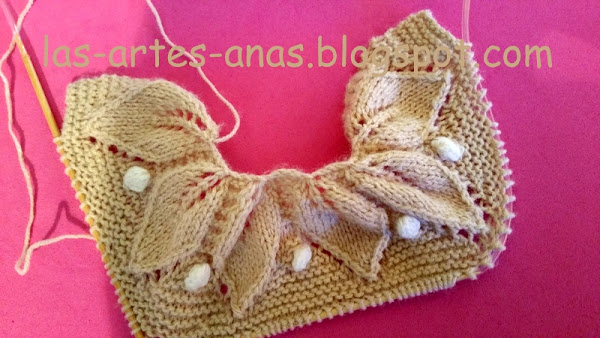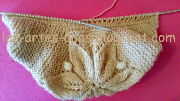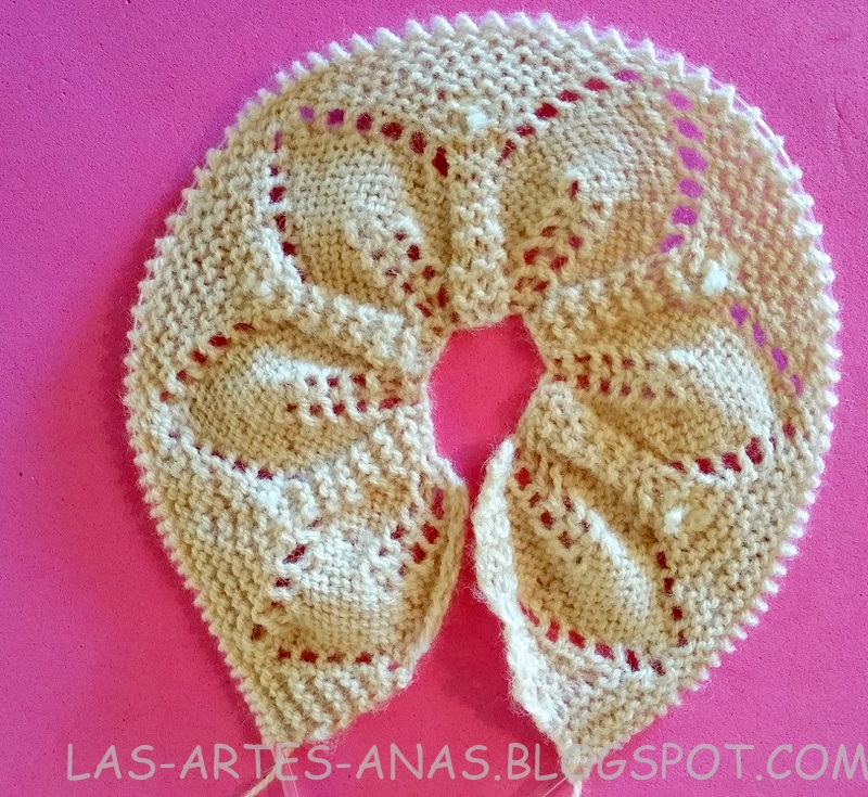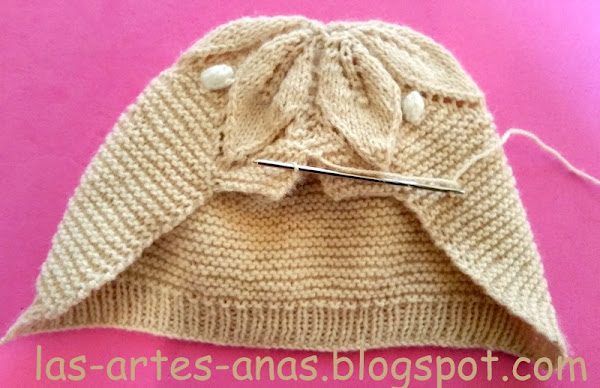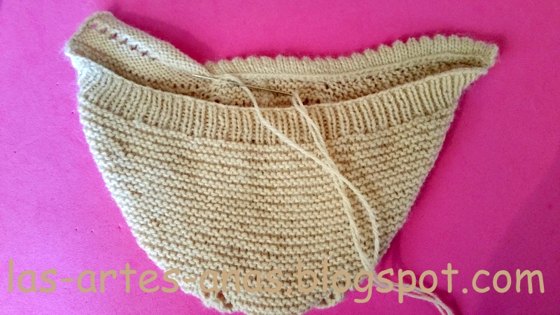 Formar el calado que forma el pico para doblar, tejiendo 1 aumento o lazada y 2 puntos juntos en toda la pasada del derecho, trabajar otros 4 pasadas a jersey y cerrar todo recto, coser como veis en la ímagen