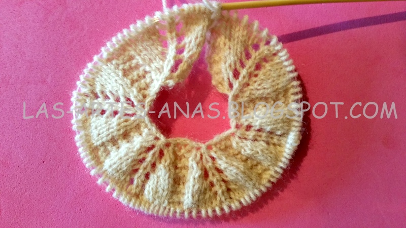 HASTA TENER 6 cms, desde la punta de la hoja, tejemos la cenefa a elástico 1-1, 1 cm y medio más