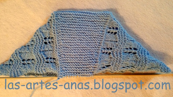 Al mismo tiempo aumentamos 20 puntos en cada extremo y tejemos a punto revés jersey, para formar el cordón, doblamos y cosemos