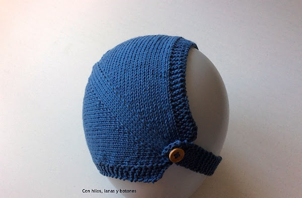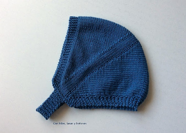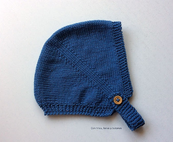 1 ovillo de algodón Drops Safran (color 06 azul denim). No se necesita el ovillo completo, con menos de la mitad es suficiente así que esta capota es el proyecto ideal como complemento a un pelele, un jersey o una chaquetita.