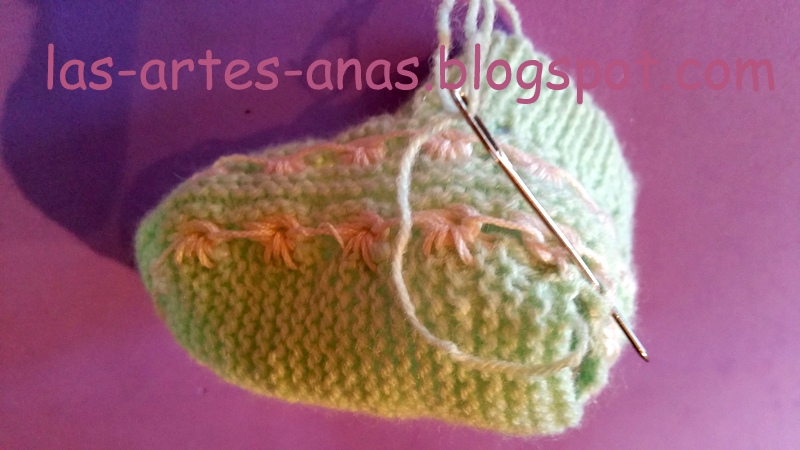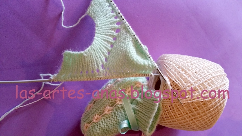 AHORA VAMOS A TEJER LOS patucos a juego, montando 45 puntos para la cenefa en canale 1-1, con agujas del 2 durante 2 cms, tejer el calado de los picos, para pasar el lazo y dejando en ESPERA LOS PUNTOS LATERALES, tejer los 12 centrales a punto bobo, durante 32 pasadas, recoger ahora todos los puntos en espera MÁS LOS LATERALES DEL PUNTO BOBO que hemos tejido, total 75 puntos, en nuestra aguja, COMENZAR A HACER EL DISEÑO DEL PUNTO CARACOL