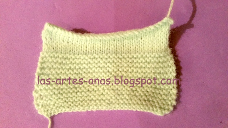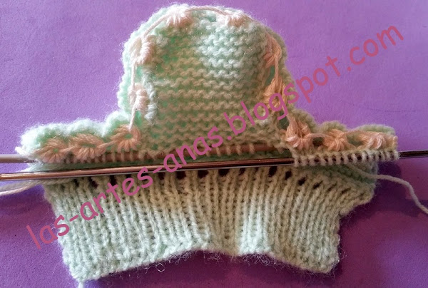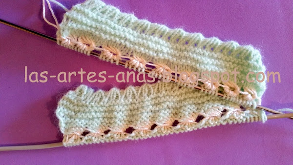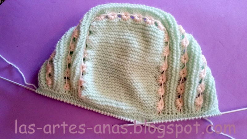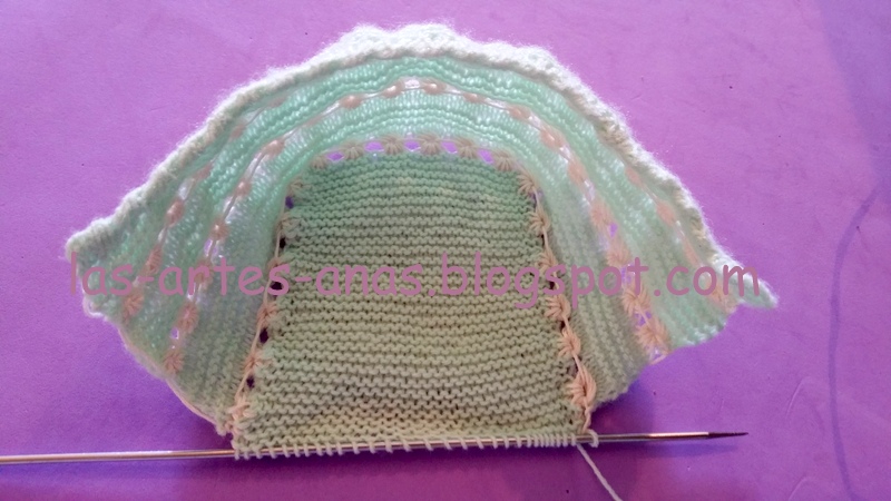 RECOGEMOS 64 PUNTOS DE LOS LATERALES, con la aguja del 2, y hacemos 6 pasadas a jersey, el calado de picos, 2 puntos juntos, un aumento, (para doblar por ahí) y otras 6 pasadas a jersey, cerrar RECTO