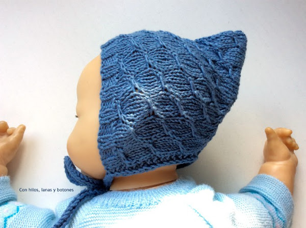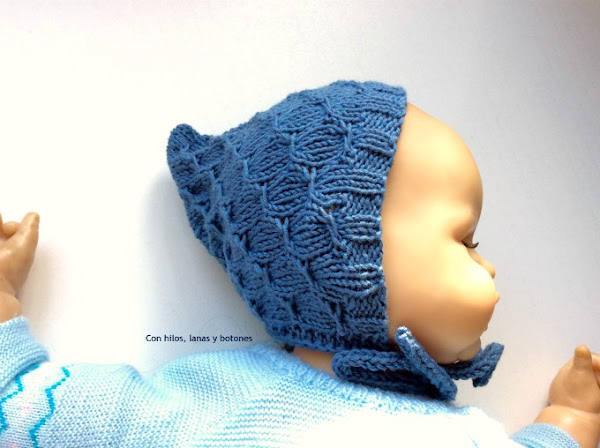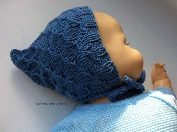 El otro día os enseñaba el pelele Urban que hice para Nicolás. Y claro, un pelele así sin más como que queda un poco soso, ¿verdad?, así que lo acompañé de una capota de punto para completar el conjunto.