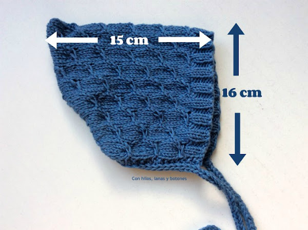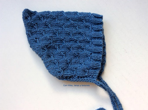 La capota va empezada por la frente y se va tejiendo hacia atrás. Se teje en plano ida y vuelta.