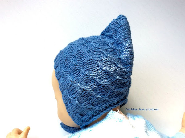 Es un gorrito de esos que llaman pixie (¿de dónde vendrá este nombre?) y que hacen que los bebés parezcan un poco duendecillos.