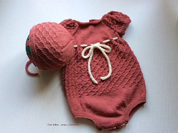 El pelele combina varios puntos distintos. Tiene punto bobo en las piernas, bocamangas y entrepierna, tiene punto jersey en el pecho, la tira de ojales para pasar la cinta, el punto fantasía del cuerpo y remata el escote con un cordoncillo. Ya veis que hay bastante variedad.