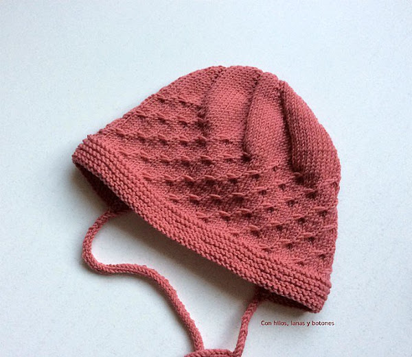 Para hacer la capota quería combinar todos esos puntos para que se reflejara el diseño del pelele y quedara perfectamente coordinado. Es por eso que en la coronilla lleva punto jersey con aumentos en forma de espiral, el cuerpo central de la capota lleva el mismo punto fantasía que el pelele, el remate de la capota del contorno de la cara va en punto bobo y el remate de la nuca va con cordoncillo que se alarga para formar las cintas para atar.