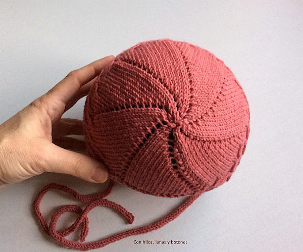Para hacer la capota quería combinar todos esos puntos para que se reflejara el diseño del pelele y quedara perfectamente coordinado. Es por eso que en la coronilla lleva punto jersey con aumentos en forma de espiral, el cuerpo central de la capota lleva el mismo punto fantasía que el pelele, el remate de la capota del contorno de la cara va en punto bobo y el remate de la nuca va con cordoncillo que se alarga para formar las cintas para atar.