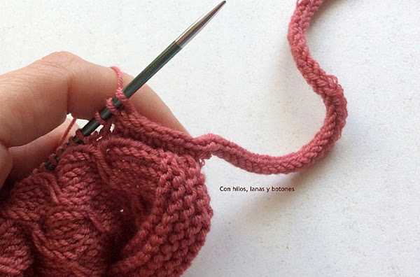 Fila 5: 1 punto derecho, (4 puntos derecho, sacar 3 puntos a una aguja auxiliar y reservar por detrás de la labor, 1 punto derecho, tejer los puntos de la aguja auxiliar al derecho) 12 veces, 1 punto derecho.