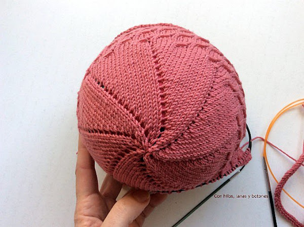 La capota va empezada por la coronilla y se va tejiendo hacia la frente. Se teje en plano ida y vuelta.