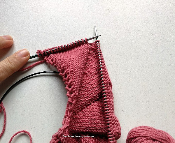 LD (lado derecho de la labor): 32 puntos derecho, aumento hacia la derecha (M1R), 32 puntos derecho, aumento hacia la derecha (M1R), 32 puntos derecho, dejamos los últimos 17 puntos en espera. Giramos la labor.