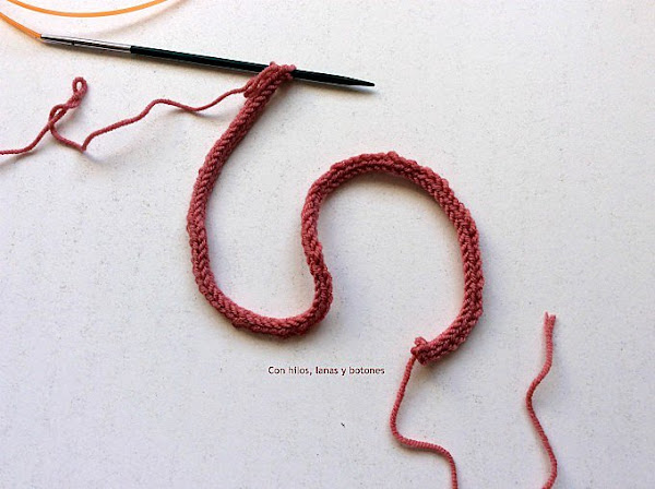Dejamos nuestra capota en espera y hacemos un i-cord o cordón tubular de 3 puntos que mida aproximadamente 30 cm.