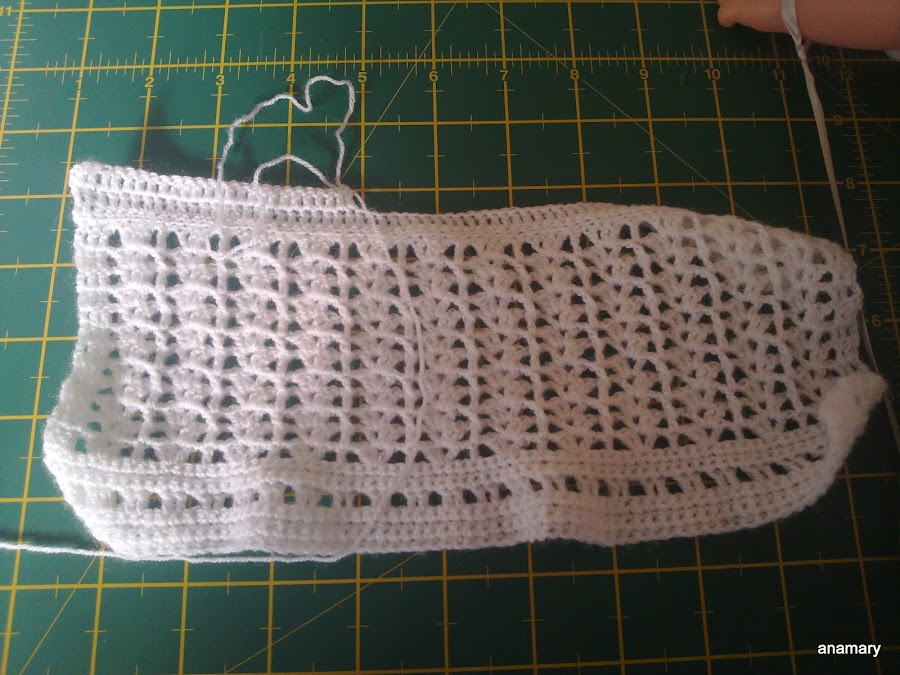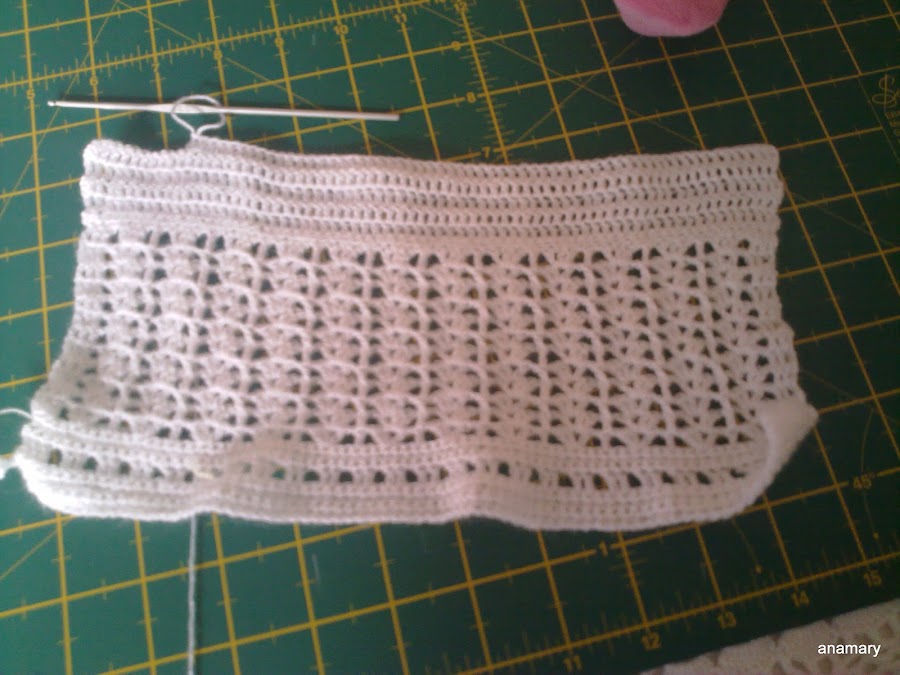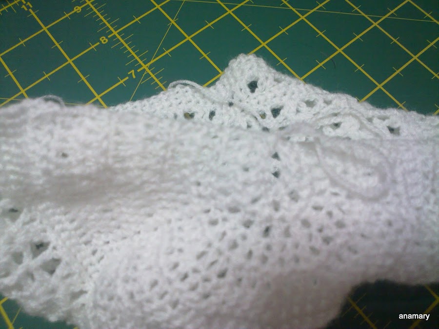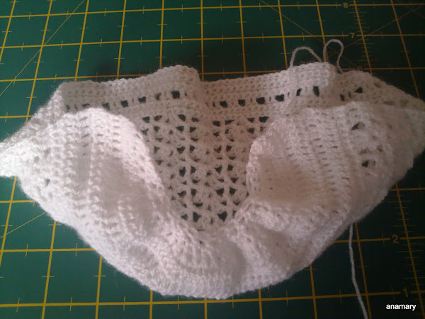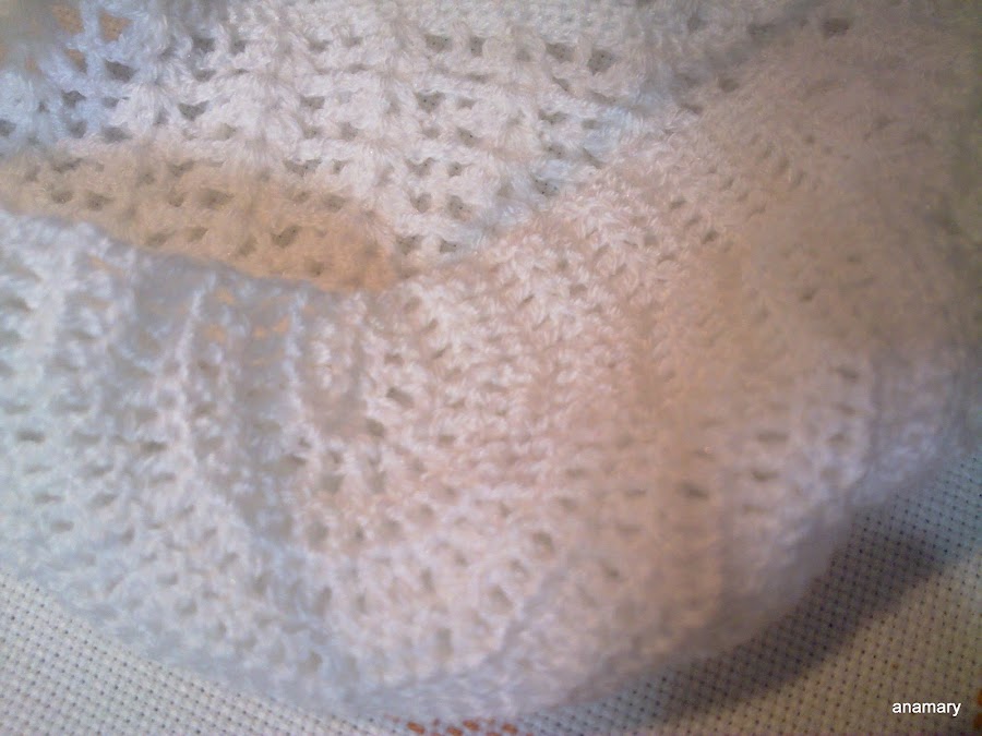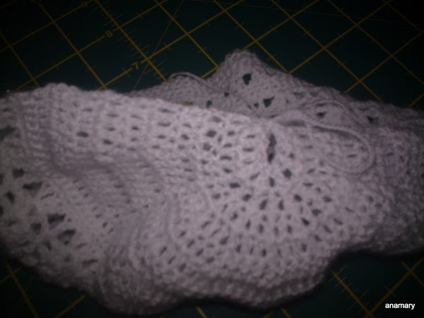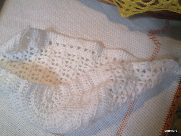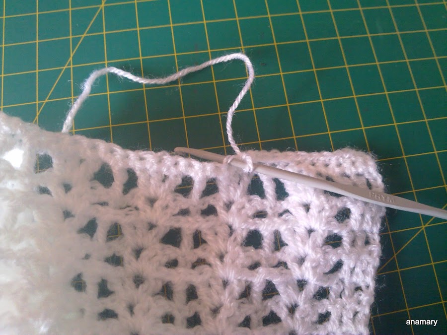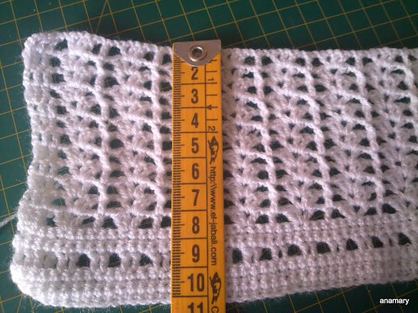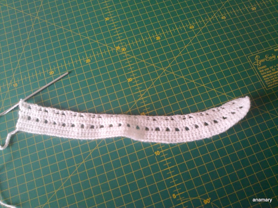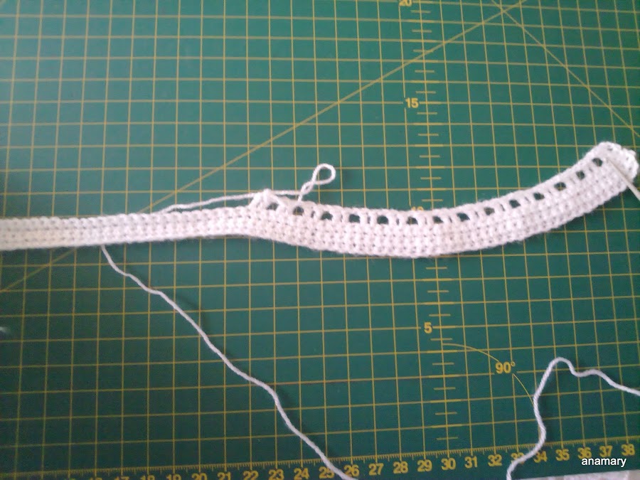 montamos una cadeneta de base de 26-28 cms. y trabajamos 3 v. a punto bajo,hacemos una vuelta de pasacintas,trabajando 2 puntos altos,1 cadeneta saltamos un punto y trabajamos 2 puntos altos ,asi hasta el final de la vuelta