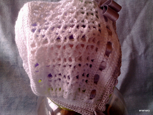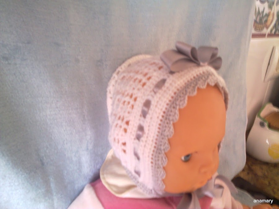 capotita de bebe...está realizada con lana de bebe,e hilo de algodón del nº 5 en color gris,el ganchillo empleado es el nº2 de aluminio.