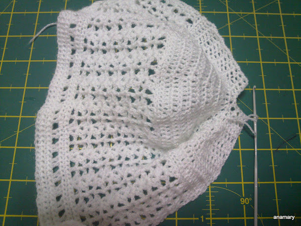 hacemos una vuelta a punto bajo,y en la segunda vuelta a punto bajo cogemos sólo una de las hebras del punto de la vuelta anterior,y hacemos una disminución de 10 puntos a lo largo de la vuelta,