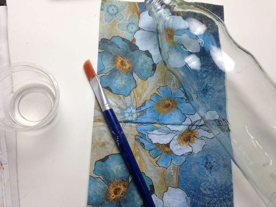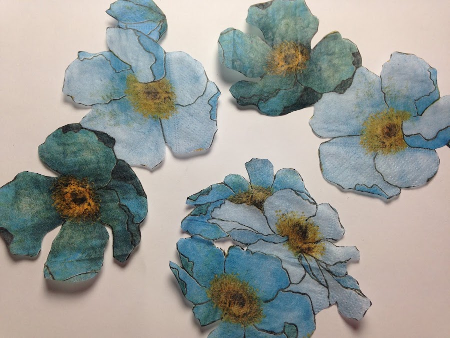 Elegir las flores de la servilleta, recortar alrededor y proceder a impermeabilizarlas. Luego de secas recortar en los contornos .