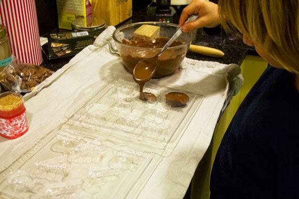 Luego hay que verterlo en los moldes con una cuchara. Esta es la parte más divertida, porque una cantidad ingente de chocolate acaba encima de la mesa, en las caras pomponiles (después de lamer la cuchara cuando te has despistado) y en general en todas partes menos en los moldes.