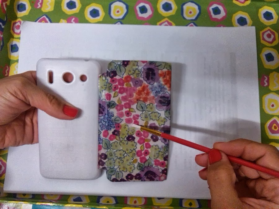 cortamos un trozo de papel un poco un centímetro mas grande que el tamaño de la tapa de la funda, empezamos a pegarla con el barniz de decoupage: