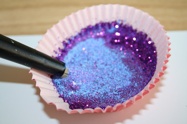 Una vez cubierta la carcasa con abundante pegamento, le echamos directamente purpurina por encima. Acordaros de poner algún papel debajo para que el sobrante no se desperdicie y podamos volver a utilizarlo.