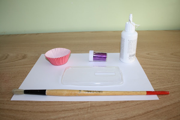 Necesitamos un bote de purpurina pequeño, una carcasa de móvil transparente, pegamento de decoupage o cola de carpintero, un pincel y un recipiente para hacer la mezcla.