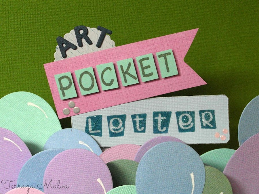 En el panel trasero he creado un cartel con el nombre del grupo. He utilizado letras troqueladas y estampadas sobre diferentes cartulinas y pegadas con 3D foam. Creo que no se observa bien en la foto que las letras de la palabra "Letter" tienen bastante volumen, pues he estampado las letras y después he aplicado una capa generosa de "Crackle Accents" que da además un efecto craquelado muy curioso.