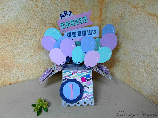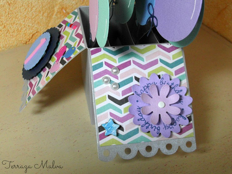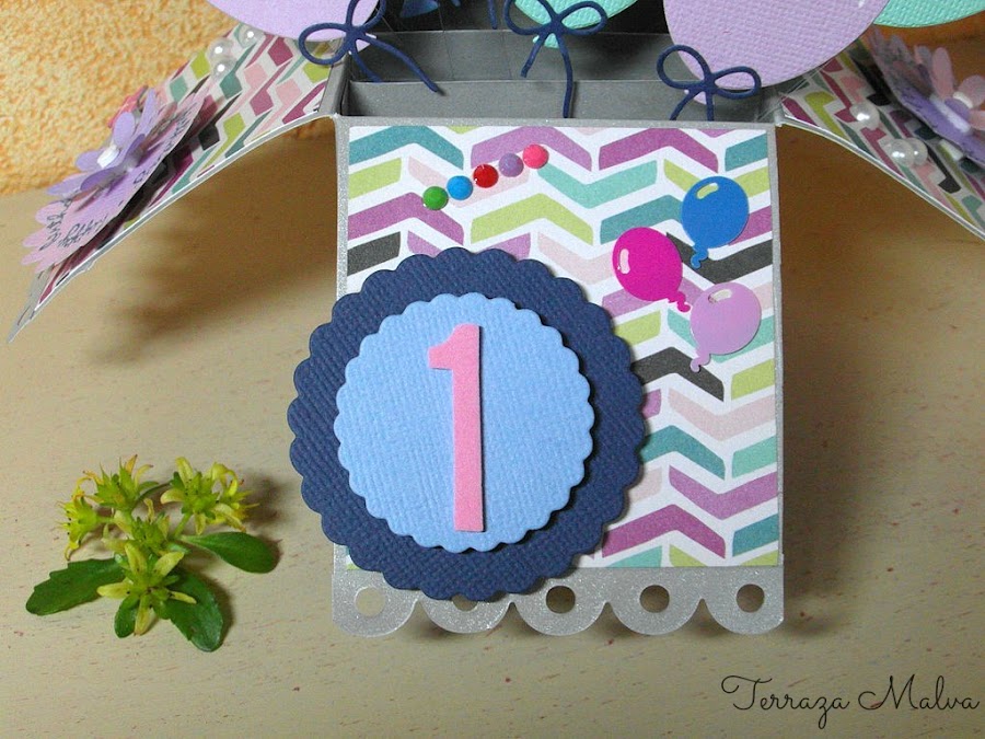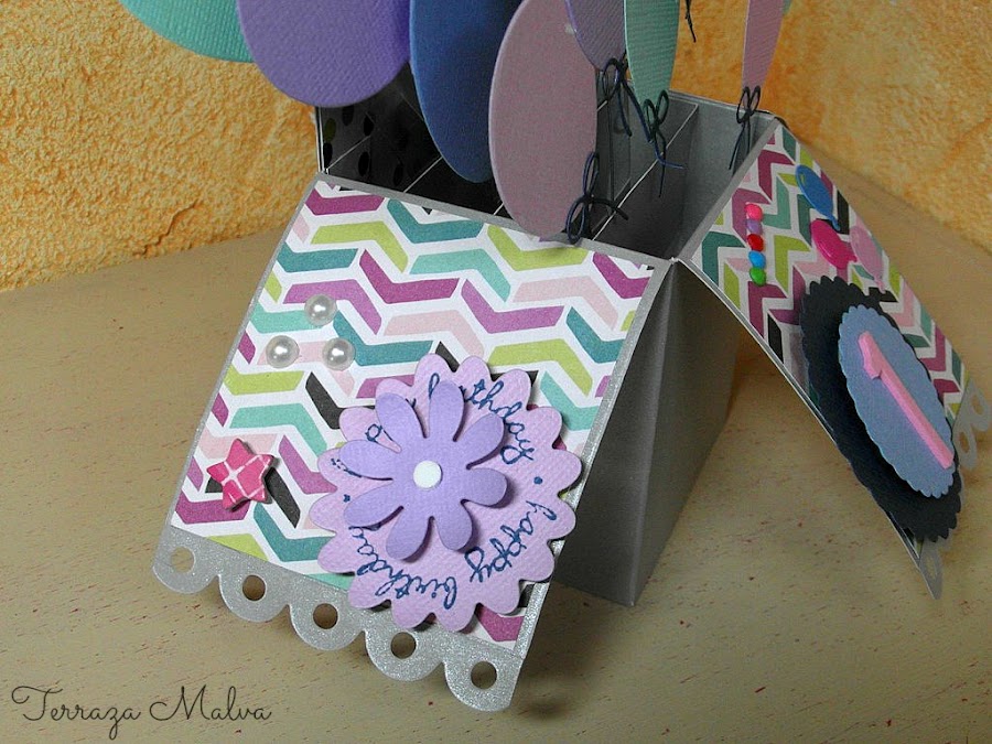 Para la base de la tarjeta he utilizado cartulina gris metalizada y he troquelado los bordes con un troquel ondulado que me gusta mucho. En los paneles he puesto unas cartulinas muy coloridas de la colección "Hello Darling" de American Crafts. Y como objetos flotantes en la tarjeta he utilizado muchos globos troquelados en cartulinas texturizadas de colores coordinados con los de los paneles.