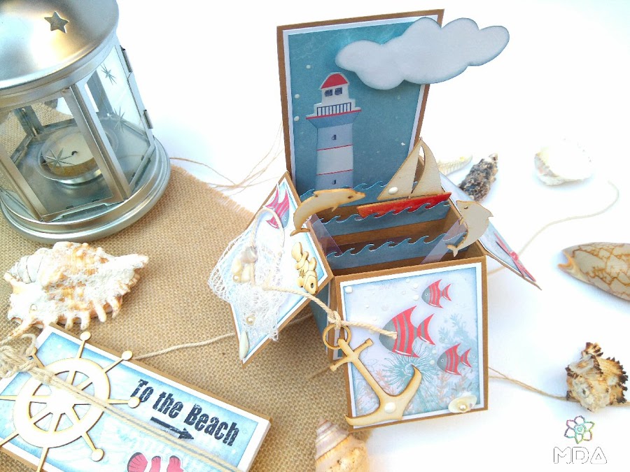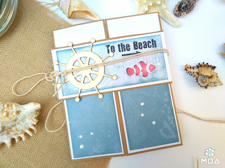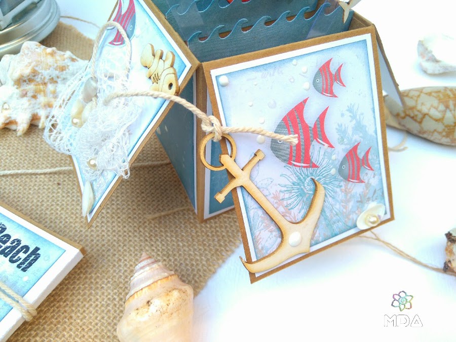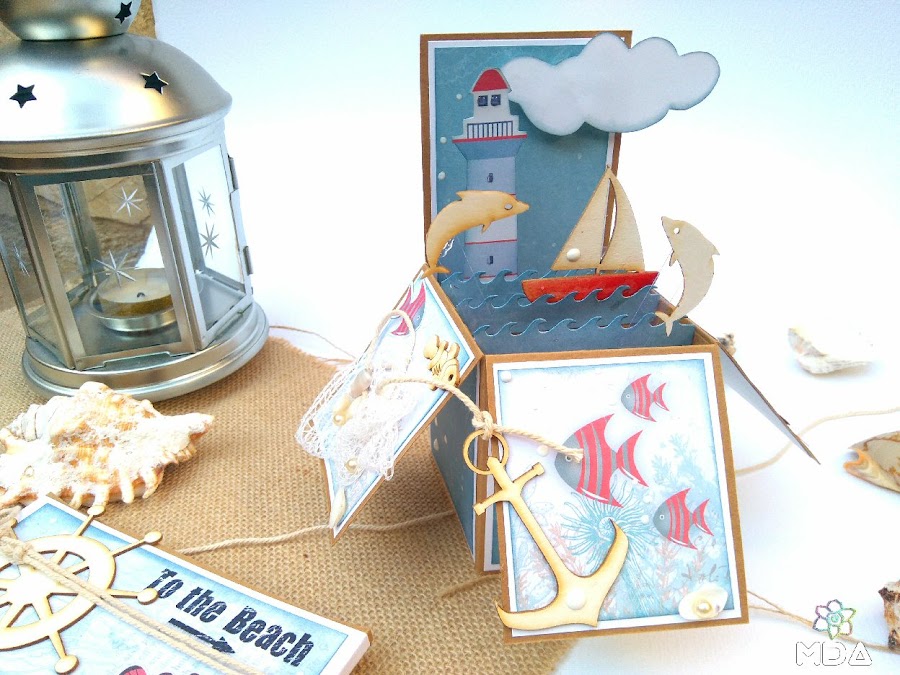 Ahora toca decorar y esto ya es a gusto de cada uno, en este caso he utilizado cartulina blanca y papel decorado para ir superponiendo capas pero no es imprescindible hacerlo de esta manera. También he usado algunos de los recortables de la colección y por supuesto, chipboard de Kora Projects ( Timones, Velero, Ancla, Peces y Delfines ) entre otros elementos.