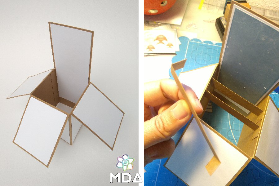 Una vez montada la estructura y pegados todos los papeles, como ves en la foto, tendrás que colocar esas tres piezas de 9 x 2 cm en el interior de la siguiente manera: dobla los bordes laterales a 1 cm por ambos lados de manera que queden 7 cm en el centro y luego pega esas pestañas a las paredes interiores de la caja.