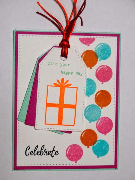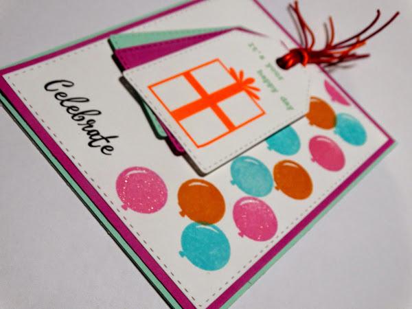 Para darle un poco de volumen a la tarjeta, ya que es tan clean & Simple, he usado goma eva para pegar el panel de los globos a la base y, para darle un toquecito más, puse Wink of Stella en los globitos naranjas.