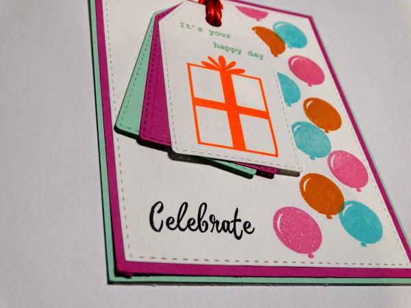Usé goma eva para dar volumen a los tags. En esta tampoco podía faltar algo de brillo, así que también usé el Wink of Stella, pero esta vez, en los globos rosas.