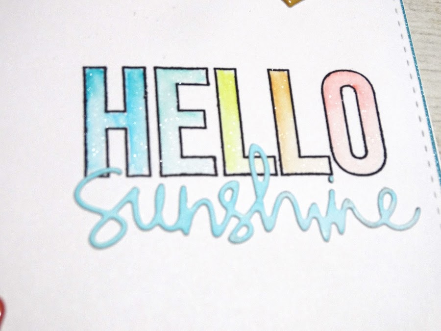 Del kit he usado las cartulinas, la blanca y la verde/turquesa con brilli, los sellos, que he coloreado con rotuladores (normales, los faber castell) y un pincel de agua para intentar hacer un degradado. El sunshine también está pintado con los mismos rotuladores. Como tienen base agua, sirven para acuarearlos. He intentado hacer un degradado y luego he troquelado el sunshine, que he pegado a la tarjeta.
