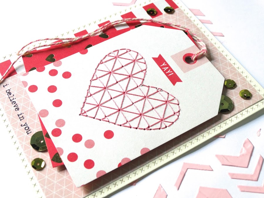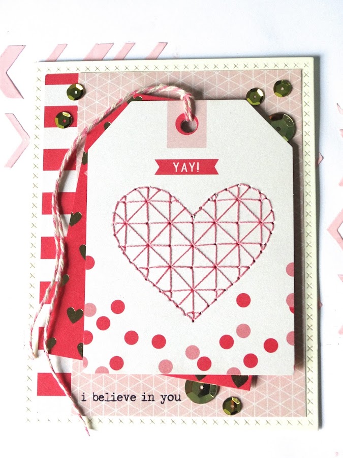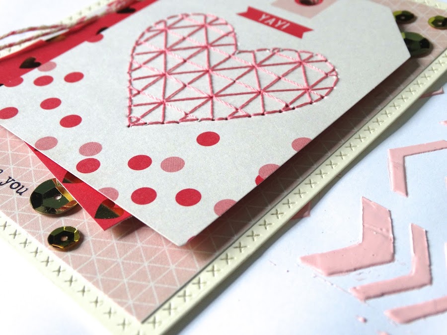 Para esta tarjeta también he usado los papeles decorados del kit, un tag que venía con las tarjetas de PL, una de las cartulinas y los sellitos. Uno para el sentimiento y también usé el sello de corazón del kit el cual, estampé y recorté y luego lo usé de plantilla para hacer agujeritos en todas las intersecciones y coserlo.