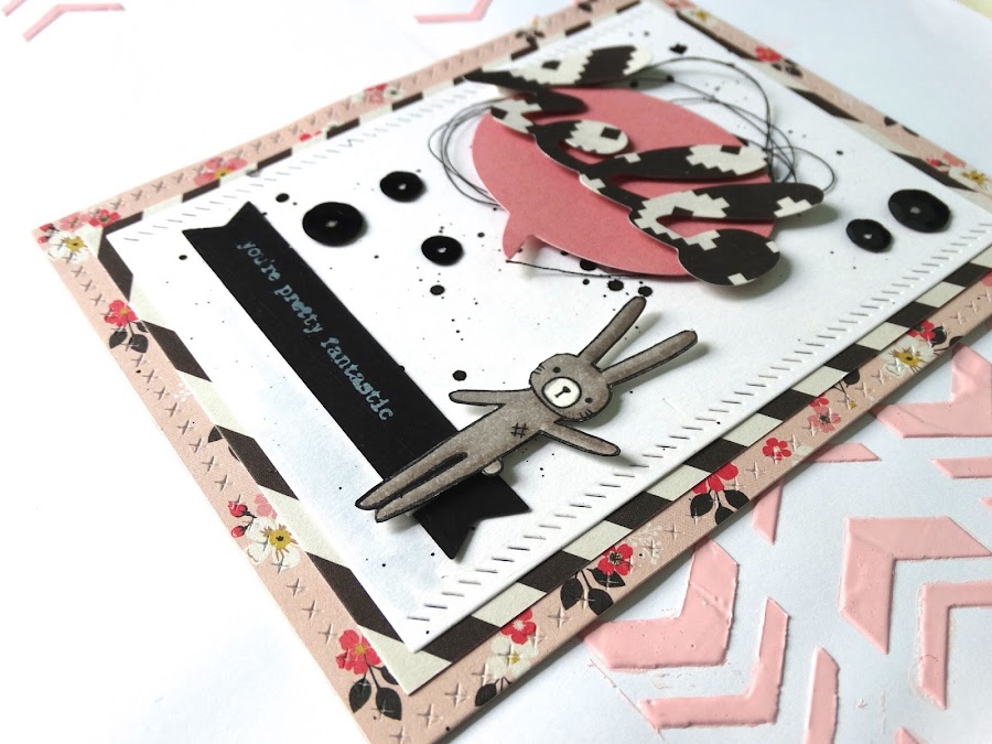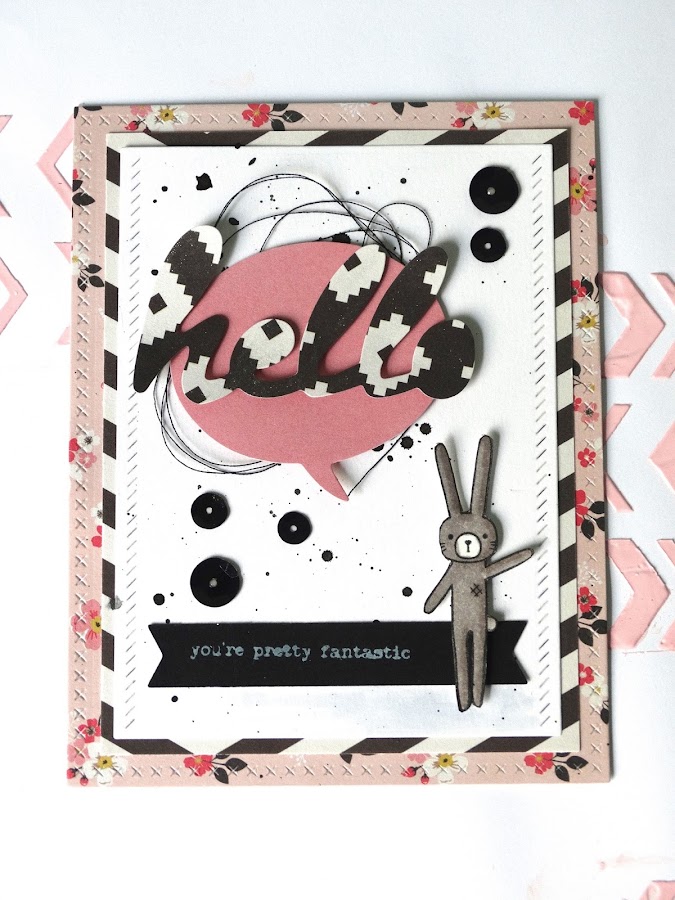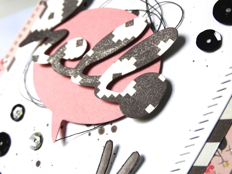El conejito es de cosecha propia. Y, para rematar con algunos detalles le puse un poco de hilo negro debajo del bocadillo, unas salpicaduras con pintura negra y unas lentejuelas. No podía faltar un poco de brilli brilli, así que puse Wink of Stella por todo el "hello". En una foto de más abajo lo podréis apreciar un poco.