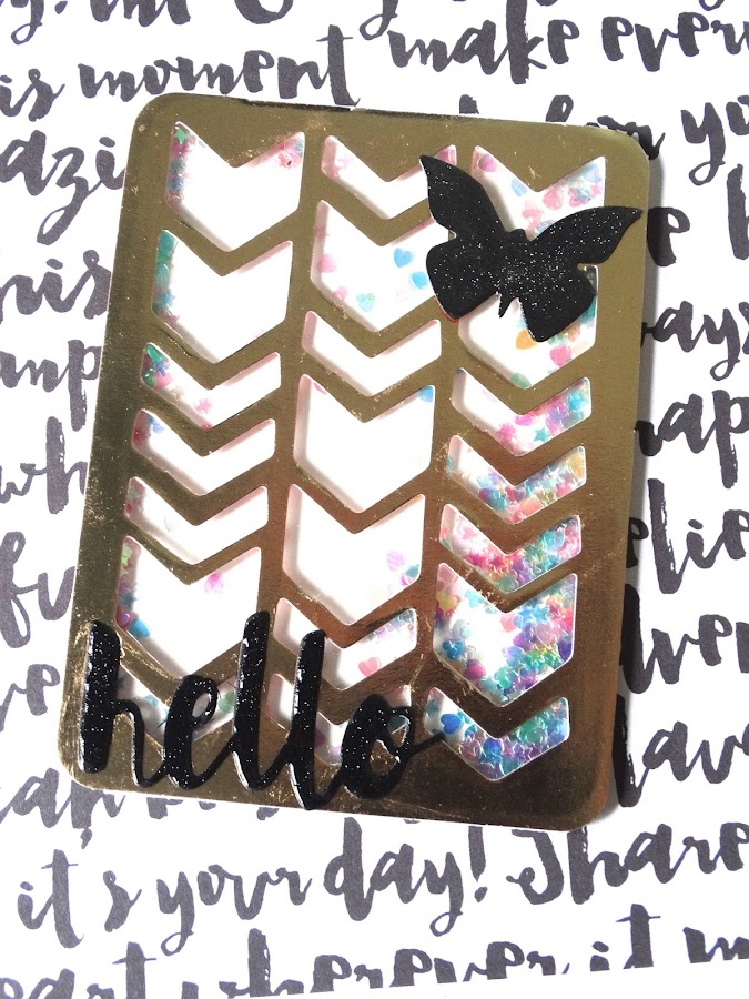 En el kit venía una tarjeta dorada con unos troquelados en forma de "flecha" que me enamoró a primera vista, pero no quería usarla así tal cual venía, así que hice una shaker jeje